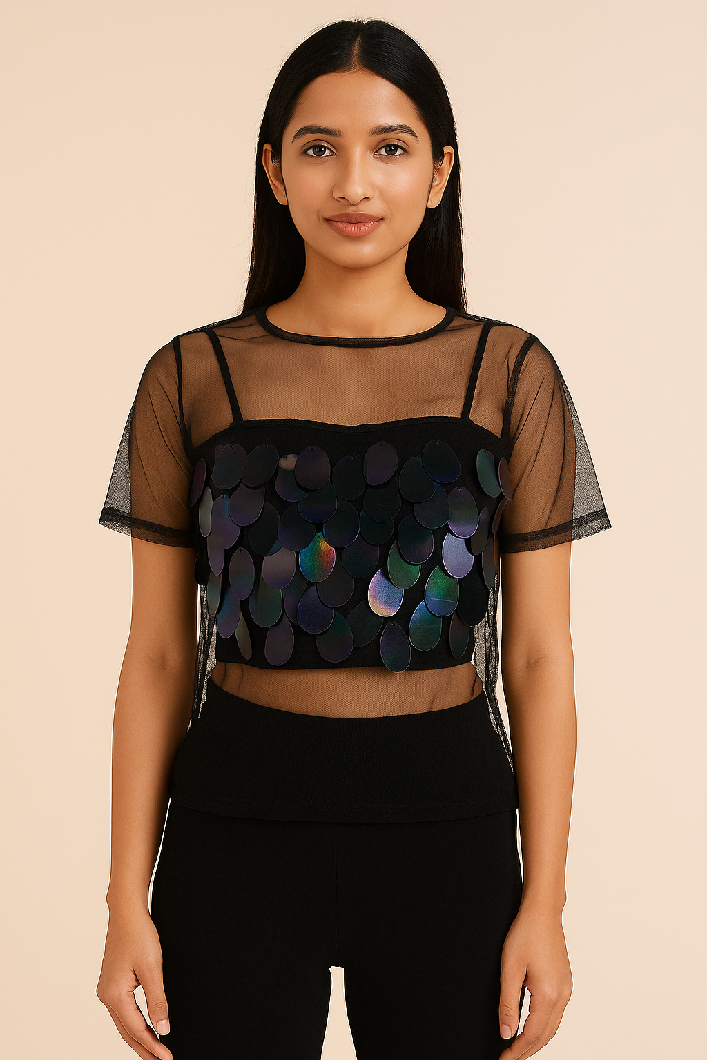 This top is a vibe. The Sheer Sequin Illusion Top is designed to make you shine—literally. Crafted from lightweight mesh with oversized iridescent sequins across the bust, this top channels bold glam with a Gen-Z twist. It’s daring, dramatic, and perfect for concerts, after-parties, or festival fits.